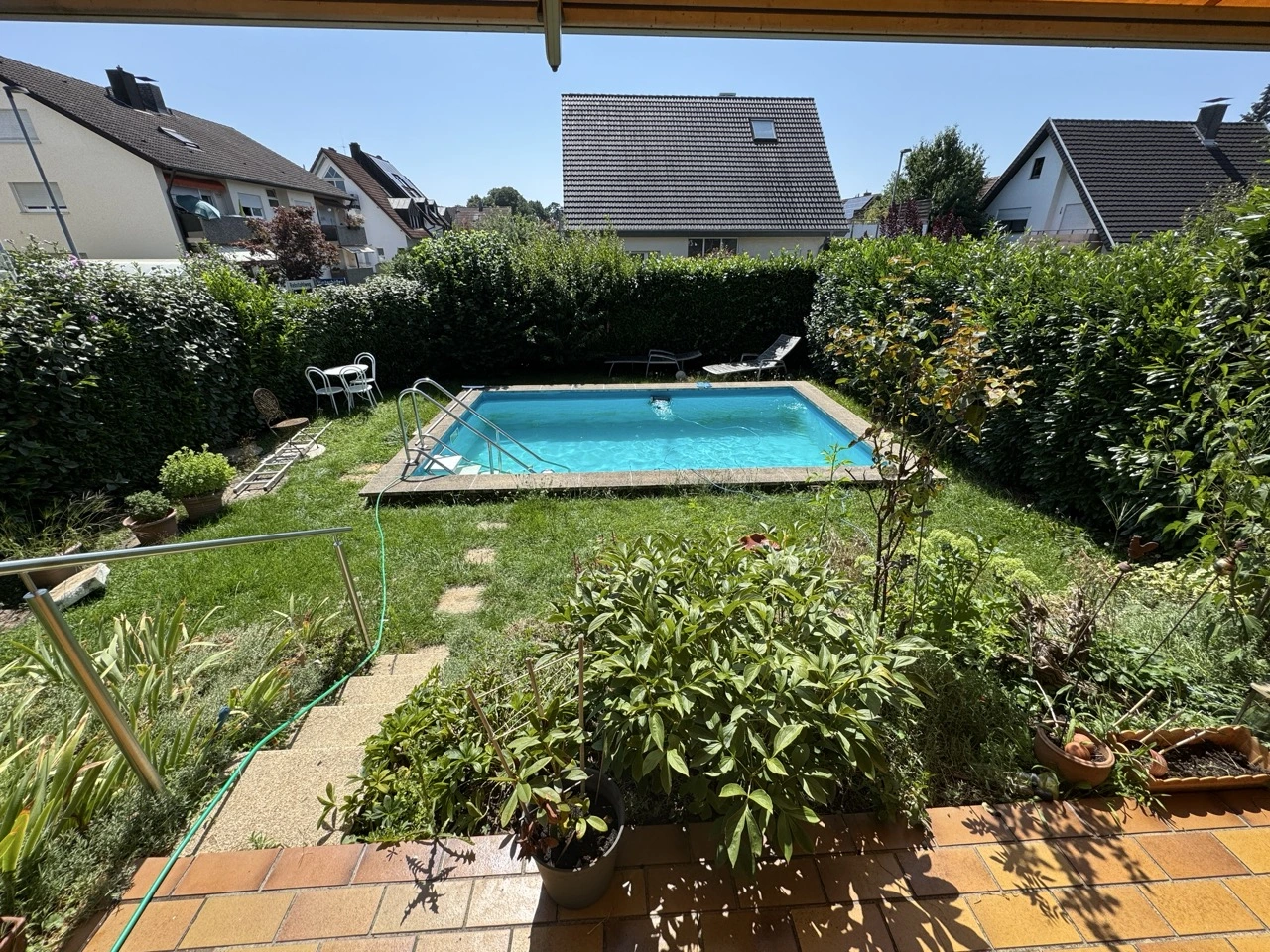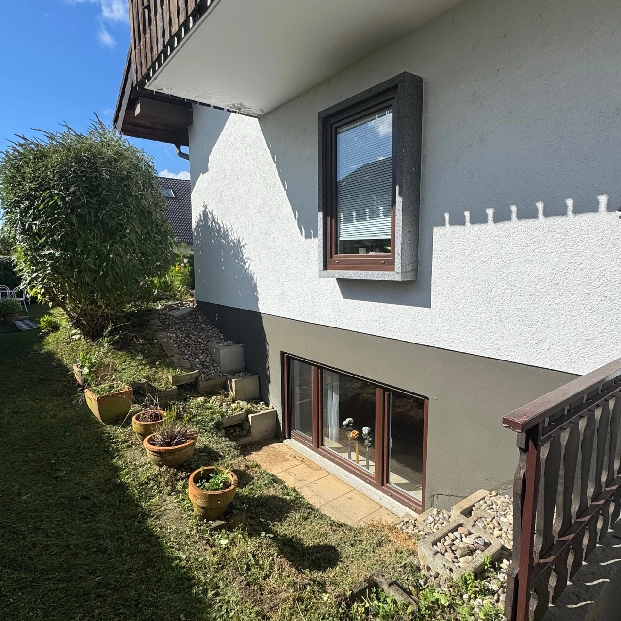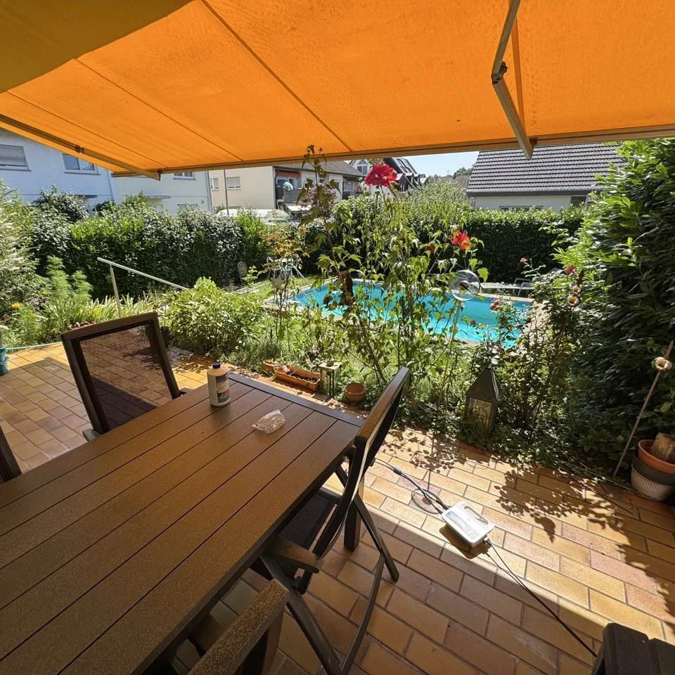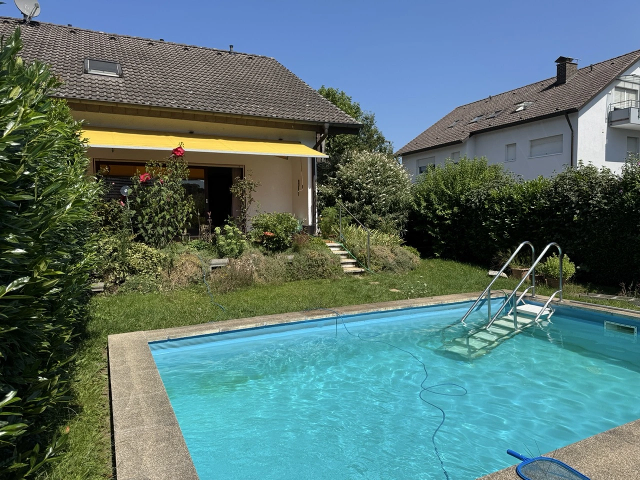 Das EG besteht im Wesentlichen aus einer Küche und einem hellen, offen geschnittenen und großzügigen Wohn- und Essbereich, außerdem noch WC, Abstellraum und Diele. Im OG befinden sich drei große Zimmer und das Bad. Im Keller finden Sie neben der Heizung und dem Werkraum noch ein großes Zimmer und ein großes Bad mit vollem Wohnwert. Einige Sanierungen wurden in den letzten Jahren durchgeführt: neue Fenster, Fassadenanstrich, Balkonsanierung sowie eine neue Küche. Absolutes Highlight ist natürlich der einladende Pool im Garten, welcher in den neunziger Jahren nachträglich eingebaut wurde und bis heute einwandfrei funktioniert.